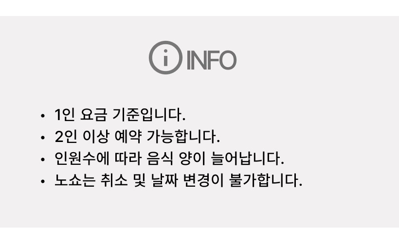 - 자리 및 식사가 예약되므로 인원수에 맞게 예약 부탁드립니다.