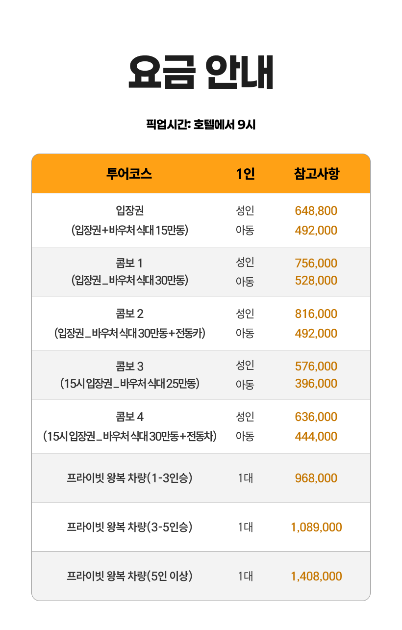 •왕복 차량 옵션 선택 시 다낭 시내 호텔 픽업/드랍 기준 입니다. 외각 지역 경우는 추가 요금 발생합니다. (문의 요망)