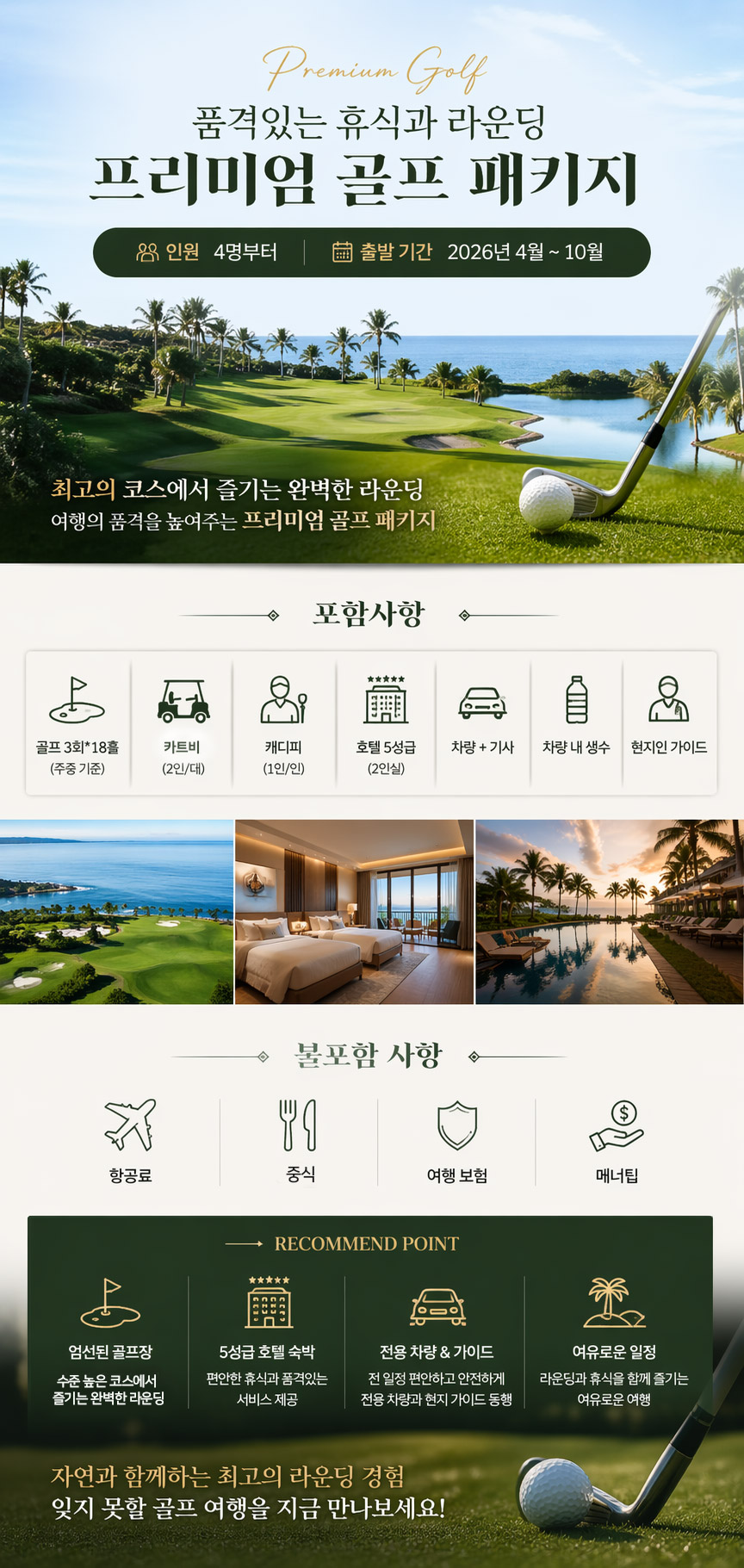5성급 호텔 (3박, 2인/실), 현지인 가이드, 차량 & 현지인 기사, 주중 골프 18홀*3회, 캐디피 (1인/1인), 그린피, 카트비 (2인/대), 일정상의 입장료, 석식