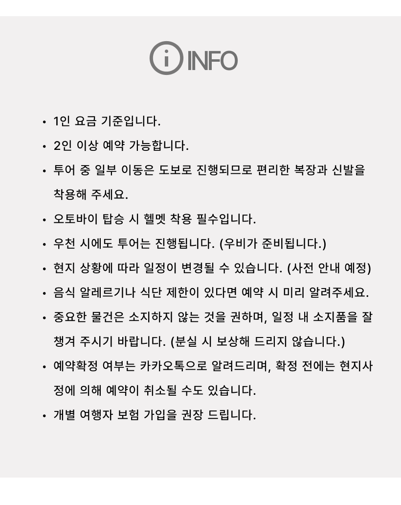 - 우천 시에도 투어는 진행됩니다. (우비가 준비됩니다.)
