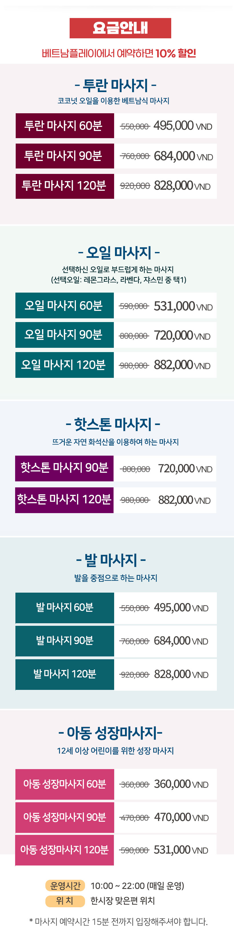 60분 50,000동(2$), 90분 70,000동(3$), 120분90,000동(4$)은  샵에서 직접 지불 하시면 됩니다.