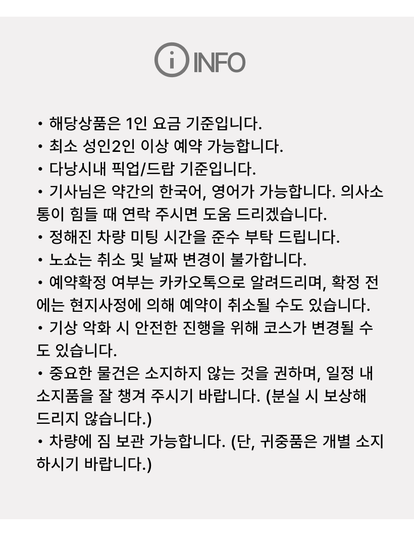 - 변경은 이용일기준 4일전까지 1회만 가능하며, 현지사정에 따라 변경이 불가할 수 있습니다.