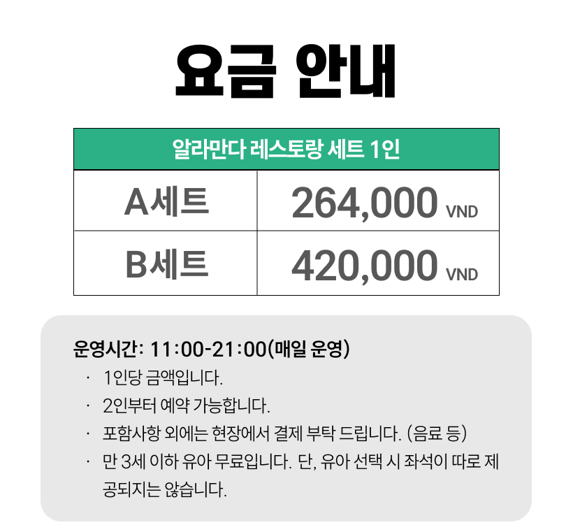 - 식사를 이용하는 고객께서는 알러지 정보를 사전에 미리 말씀해주시기 바랍니다.
